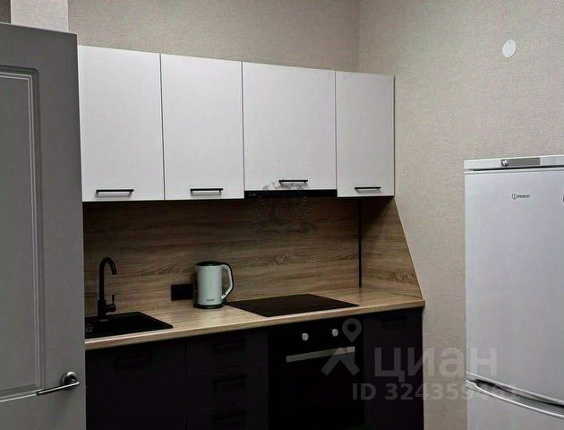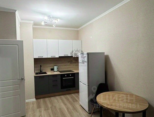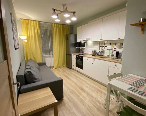 В кухне-гостиной: обеденный стол, стулья,небольшой раскладной диван, телевизор, кухонный гарнитур, выполненный на заказ, варочная поверхность, духовой шкаф, вытяжка, холодильник, микроволновая СВЧ-печь, чайник.