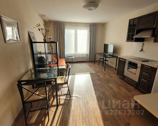 Просторная гостиная, совмещённая с кухней — светлое пространство для приёма гостей и готовки.
