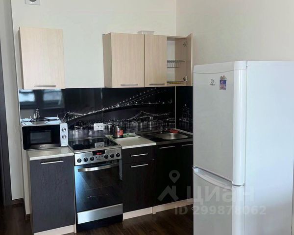 Есть все необходимое для комфортного проживания: современная кухня со встроенной техникой (варочная поверхность и духовой шкаф, вытяжка, холодильник).