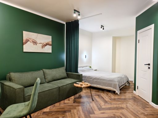 Квартира состоит из прихожей, кухни-гостиной, спальни и ванной комнаты. Имеется полукруглый балкон, окна выходят на улицу. Сохранены оригинальные детали: дубовый паркет, двухстворчатые двери, чугунные кремоны на окнах, лепнина, арочная дверь на балкон. У нас есть красивейшая посуда и фарфоровый чайный сервиз!