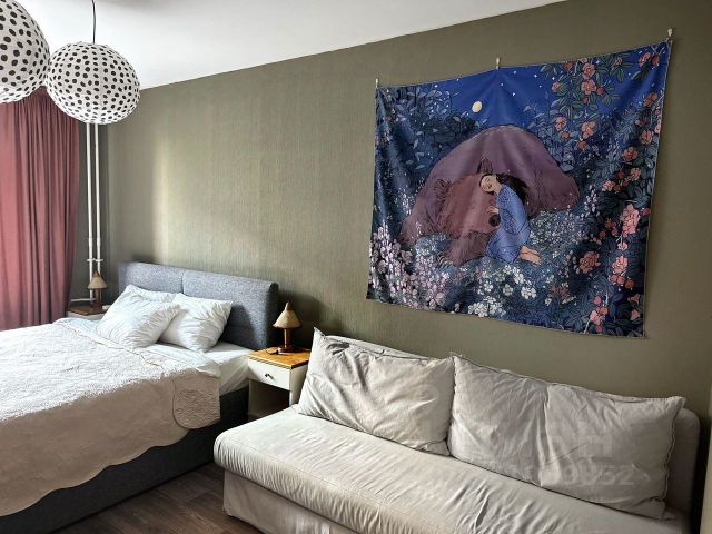 Спальные места: изолированная спальня 13 кв.м. с двуспальной кроватью 180х200, кухня-гостиная 15 кв.м. с двухместным диваном 160х200. Дополнительное спальное место раскладушка 90х190 предоставляется по запросу.