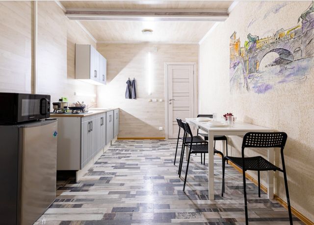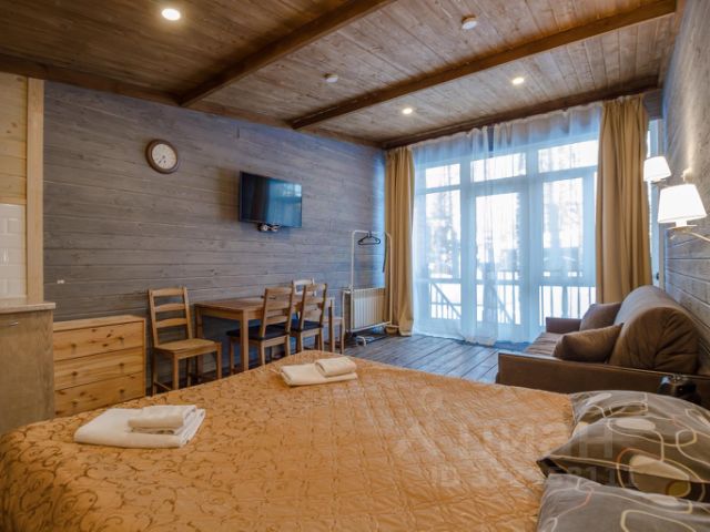 Апартаменты для двоих с одной большой двуспальной кроватью. В номере есть все необходимое для комфортного отдыха на несколько дней вблизи г.к. Игора и автодрома "Игора-Драйв". Оборудованная кухня, тв, обеденный столик для двоих, рейлинг для одежды, небольшие прикроватные тумбочки, комод для вещей и санузел с душевой кабиной.