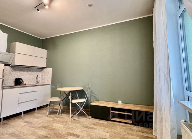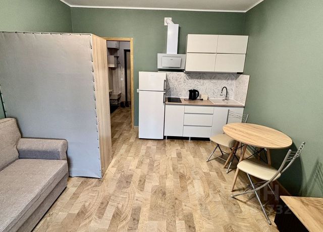 - Студия укомплектована мебелью и техникой: кухня, холодильник, плита, микроволновка, посуда, зона ТВ и телевизор, шторы, обеденная группа (стол и стулья), шкафы, полки, диван 2.30 см, придиванный столик.