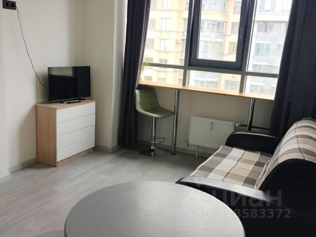 В комнате - большой телевизор. Высокий шкаф с полками и штангой для одежды вместит всё необходимое. Комфортная планировка: просторная зона прихожей, комната и кухня отделены дверями с хорошей шумоизоляцией, широкая лоджия.