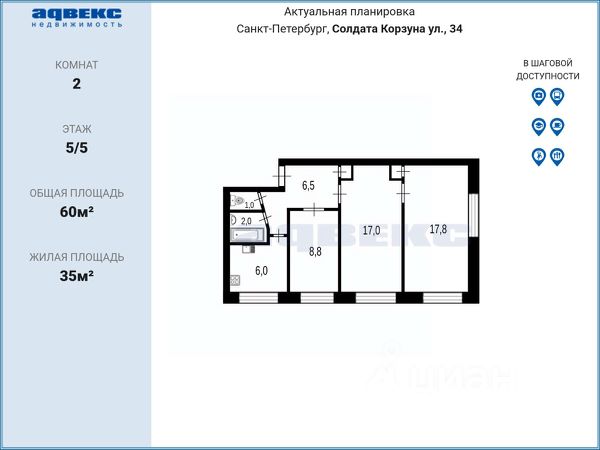 Инфраструктура развита: много магазинов, есть супермаркеты, школы, детские сады, рядом две поликлиники, в шаговой доступности, на проспекте Ветеранов, остановки общественного транспорта. До станции метро Проспект Ветеранов 15-минут пешком.