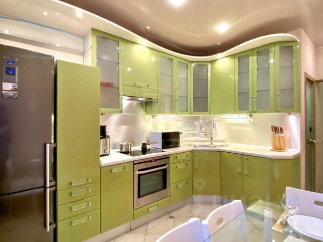 В кухне кухонный гарнитур с премиальной техникой, холодильник, духовой шкаф, варочная панель, вытяжка, СВЧ, чайник, столовая зона, комплект посуды.