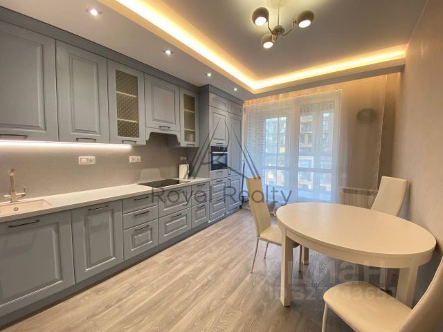 В квартире имеется кухонный гарнитур и новая бытовая техника: большой холодильник, посудомоечная машина, варочная панель, микроволновка, чайник. На кухне столовая посуда и приборы, разделочные доски, а также кастрюли и сковорода. Обеденный стол с мягкими стульями.