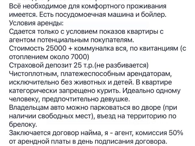 Сдам квартиру на длительный срок,все необходимое для жизни есть ..Залог равен сумме за месяц с ку.Цена 27 000+ку(со светом со всеми ку 5000-8000 в зависимости от времени года и счётчиков).Без животных!!! Заселение и просмор по предварительной договоренности,не за час-два! Заселение с 6 ноября.Оплата полностью 32 000 со всеми платежами.Залог можно разделить на 2 части ----- Примечание: у собственника могут быть дополнительные пожелания к жильцам - обсудите их в чате или по телефону