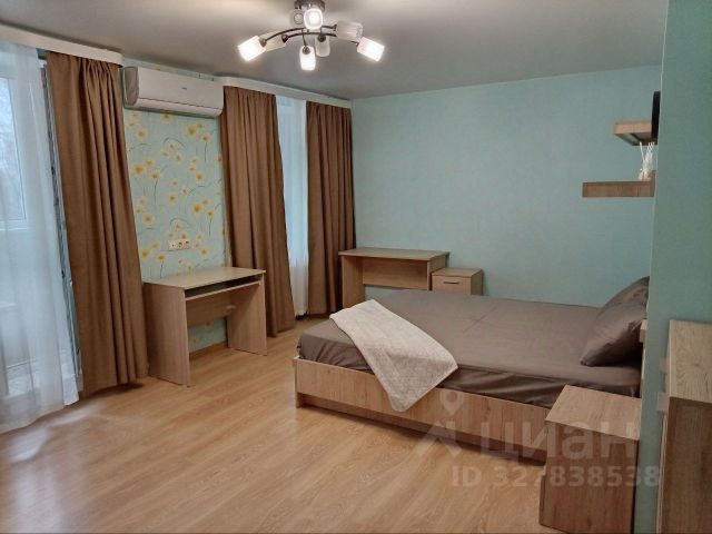 В комнате большой трехместный раскладной диван с ортопедическим матрасом, распашной шкаф, ТВ зона с телевизором, витринные шкафы, рабочая зона, журнальный столик с дополнительным освещением.