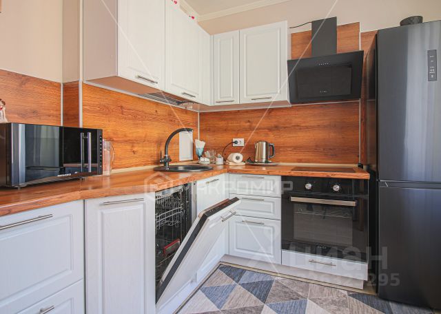 В квартире полный комплект мебели, техника: стиральная машина Candy, посудомоечная машина Weissgauff, микроволновая печь Gorenje, духовой шкаф Weissgauff, вытяжка, двухкамерный холодильник Indesit, электрочайник, ТВ Samsung; утюг, отпариватель, фен, вентилятор, пароварка, пылесос; в наличии: стремянка, гладильная доска, сушилка; в комнате и на кухне лампы с пультом управления (меняет цвет, со встроенными динамиками); у кровати, под зеркалом в ванной комнате, в шкафу установлены лампы с датчиком движения (зарядка USB); умное мусорное ведро; вся необходимая посуда; 1 комплект постельного белья, 4 подушки; огнетушитель.