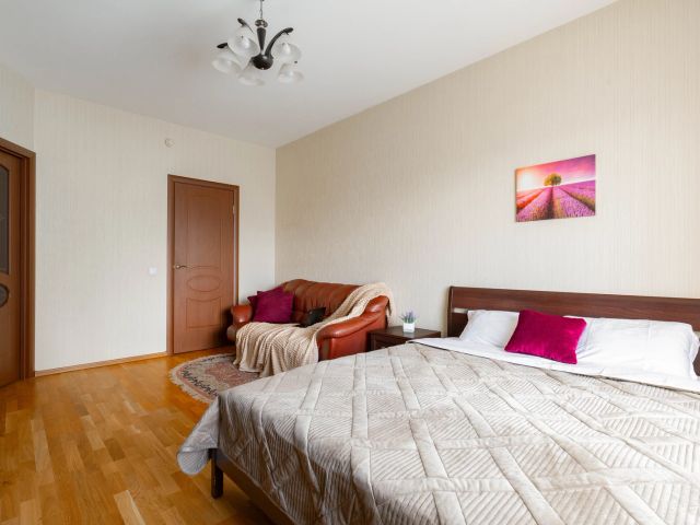 Планировка включает совмещённый санузел. Большая Комната оснащена двухспальным диван-кроватью Аскона, большой вместительный шкаф, стол под рабочее место, турник для поддержания физической формы. По всей квартире организована вместительная система хранения для вещей, в прихожей вместительная гардеробная . На кухне выход на застекленный панорамный балкон, Всё готово для комфортного проживания!