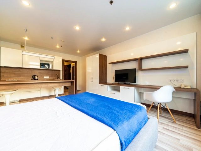 fresh renovation, electronic lock. Furniture: 180x200 cm bed (separable), desk, 2 chairs, kitchen unit, safe. Appliances: TV, Wi-Fi. Kitchen: cooktop, hood, fridge, microwave, dishes. Bathroom: shower, hairdryer. Linens provided. Pets — negotiable.