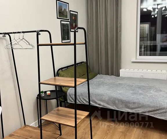 Спальную зону от кухни отделяет стеллаж для открытого хранения вещей - есть 4 полки и рейл с вешалками для длинных вещей и вместительной нижней полкой.