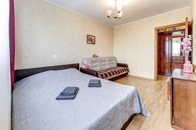 Квартира полностью оснащена всем необходимым для временного проживания гостей. В прихожей два платяных шкафа, вешалка, зеркало и стиральная машина. Комнаты светлые, в каждой из них большая двуспальная кровать и диван, который раскладывается в полноценное спальное место для двух человек.