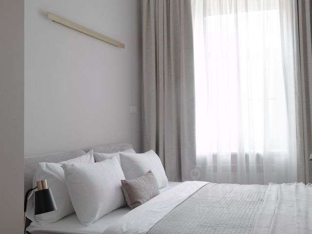 -Первая спальня, выполненная в изысканных голубых тонах, оборудована просторной кроватью размера king-sizе (160х200) с ортопедическим матрасом.