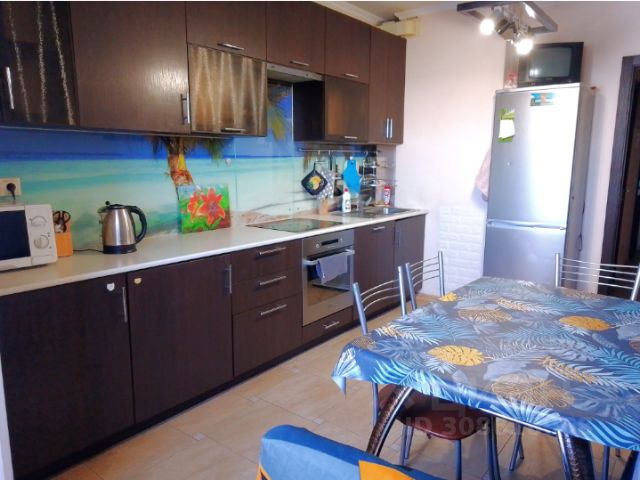 Кухня - вся кухонная мебель в наличии как на фото, холодильник, микроволновая печь, led-телевизор, электрочайник, вся необходимая посуда (тарелки, чашки, кастрюли, сковороды, столовые приборы), плита стеклокерамика, фильтр для питьевой воды с отдельным краном на раковине. Хим.средства для стирки, мытья посуды, уборки, и т.д. все есть