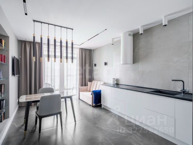 Кухня полностью укомплектована всей необходимой техникой Siemens и обладает обширной зоной хранения. Зона столовой вмещает в себя обеденный стол, где могут комфортно разместиться 8 человек. Расположившись в зоне гостиной на диване, Вы приятно удивитесь наличию в квартире домашнего кинотеатра!