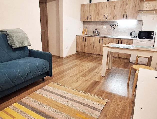 небольшая двушка, большая кровать и диван в качестве спальных мест. крохотная, но полноценная кухня с варочной поверхностью, духовым шкафом, посудомойкой, раковиной. санузел совмещенный с ванной. есть стиральная машина. есть шкафы для хранения. прихожая с необходимыми местами хранения под одежду и обувь. квартира со свежим косметическим от ремонтом, чистая. светлая.