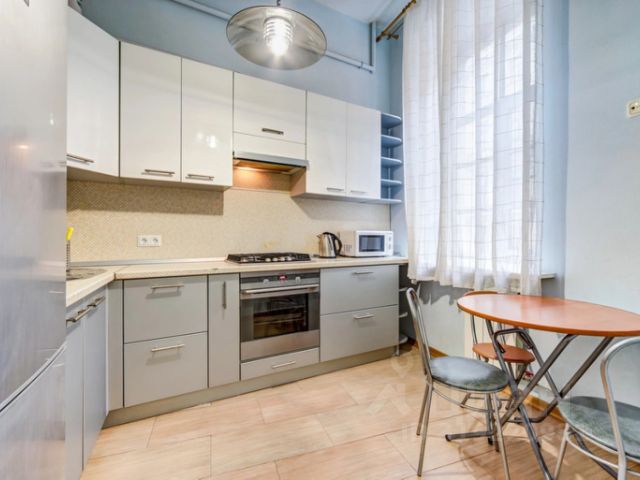 - Кухня оборудована плитой, чайником, микроволновой печью, холодильником, посудой, столовыми приборами, кастрюлей, сковородкой
