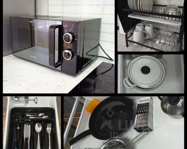 Кухня оборудована всем необходимым кухонным инвентарем (тарелки, кружки, стаканы, бокалы, кастрюли, сковороды, терка, разделочные доски, столовые приборы), все для того, чтобы приготовить обед на несколько человек.