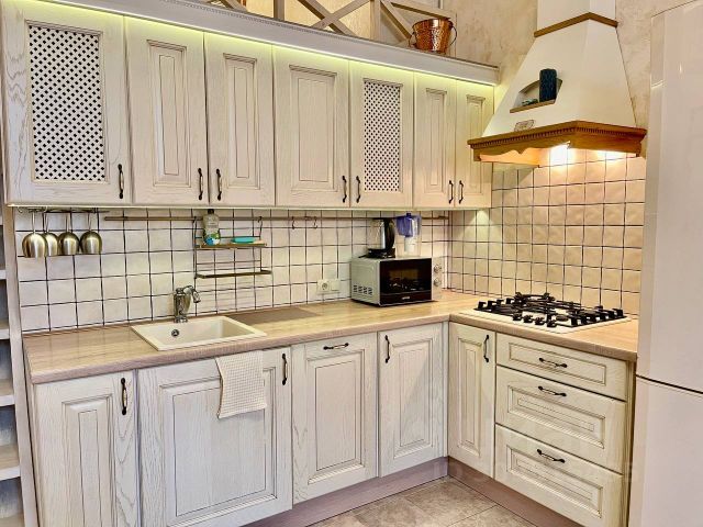 - В кухонной зоне: посудомоечная машина, холодильник, варочная поверхность, духовка, вытяжка, чайник, многоступенчатый фильтр для очистки воды, посуда и столовые приборы на любой случай. Чай, кофе, сахар, соль, конфеты.