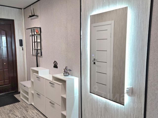 Коридор просторный. Есть вешалка, обувница с мягким сидением, ключница, зеркало с подсветкой, большая ниша с антресолью, тумбочки.