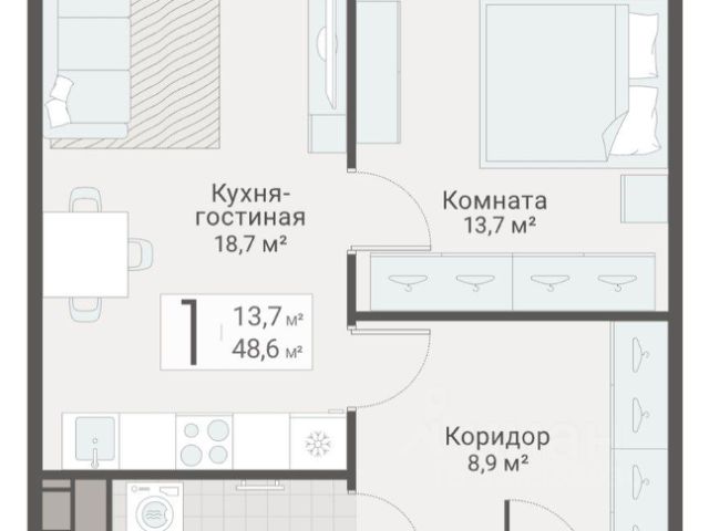 Есть всё необходимое для проживания: два дивана, два шкафа, кухонный гарнитур, двухкамерный холодильник, стиральная машинка, микроволновая печь, обеденный гарнитур, телевизор, чайник. Проведён WiFi.