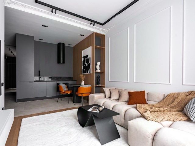 Гостиная совмещена с шикарной кухней, выполненной по индивидуальному проекту с использованием шелковистых матовых фасадов, черного гранита и столешницы из натурального дуба.