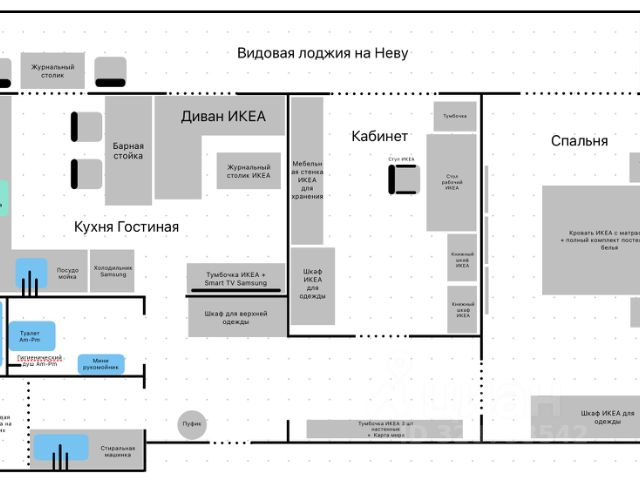 Техника: телевизор со смарт-тв, холодильник, стиральная машина, варочная поверхность, микроволновка, электрический чайник.