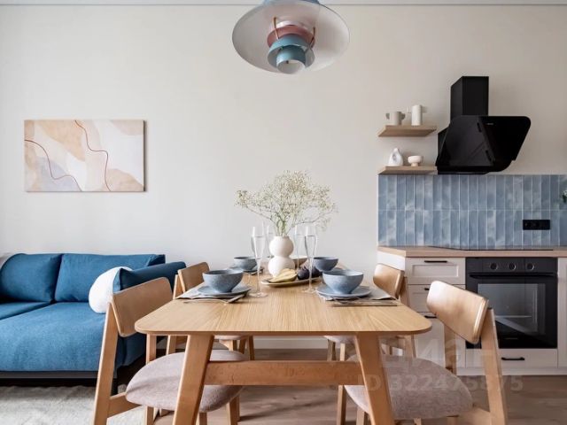 На кухне есть обеденный стол, который может использоваться как рабочее место. Рядом есть розетка и удлинитель.