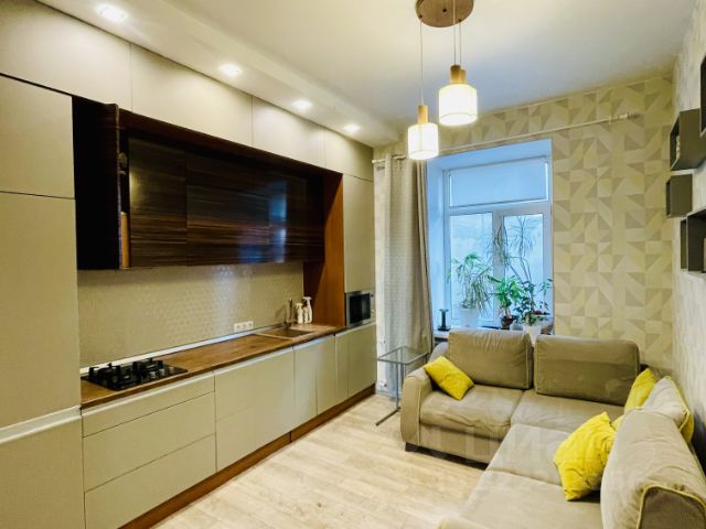 Посудомоечная машина, двухкамерный холодильник Bosch, духовой шкаф + индукционная плита Bosch, СВЧ Electrolux, эл.чайник, вытяжная вентиляция, ТВ, угловой диван, стол с комплектов стульев.