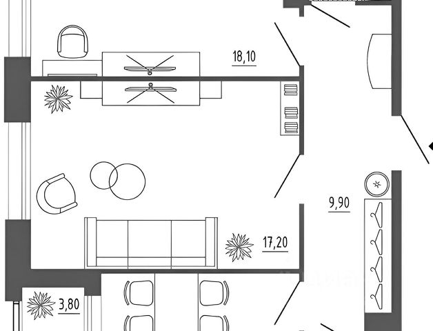 * В квартире 2 отдельные кoмнаты, 2 санузла (в ванной комнате тёплые полы), просторная кухня-гостиная 18 кв. со всей новой встроенной техникой. Изюминка квартиры - большой балкон, как отдельная зона отдыха.