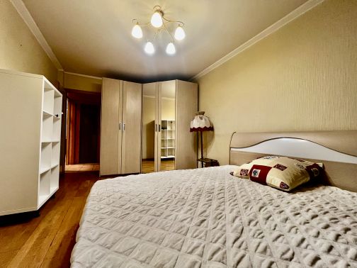 -Мебель (двуспальная кровать 180*200 с подъемным механизмом и местом для хранения, 2 раскладных дивана, тумбочки, большой стеллаж, раскладной рабочий стол, кухонный гарнитур, обеденный стол со стульями, система хранения на балконе, большой и малый шкафы-купе и шкаф-вешалка в прихожей)