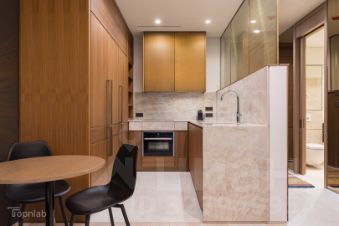 Ремонт квартиры выполнен с использованием только натуральных материалов: подоконники, столешницы, лестница, полки, перила на 2 ярус выполнены из дуба, стены в санузле -натуральный мрамор Calacatta.