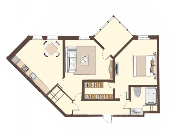 Евродвушка - это квартира с одной спальней (без окна) и гостиной, объединенной с кухней.