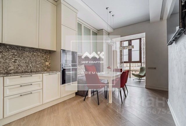 В квартире выполнен дизайнерский ремонт, вся планировка продумана до мелочей. Из квадратной формы просторной гостиной с тремя окнами имеется выход на кухню и спальную комнату со своей гардеробной.