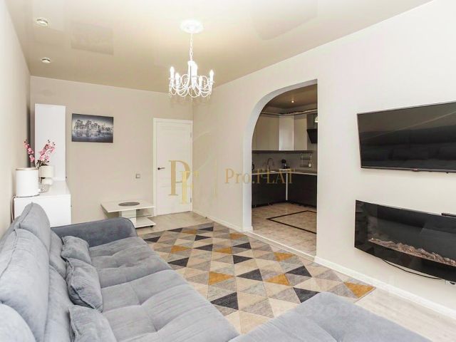 Гостиная-кухня — сердце дома: лёгкая, воздушная, с панорамными окнами и четырьмя балконами, словно ступенями к небу. Здесь вас встречает гигантское абстрактное полотно в раме со светодиодной подсветкой — как живой закат, застывший в янтаре. Деревянный паркет теплого оттенка, мягкий бежевый диван, розовые бархатные кресла и хрустальный люстр-скульптура — всё продумано до деталей. А кухня в стиле "сдержанная роскошь" с встроенными техникой и мраморной столешницей — место, где готовить — удовольствие, а завтракать — ритуал.
