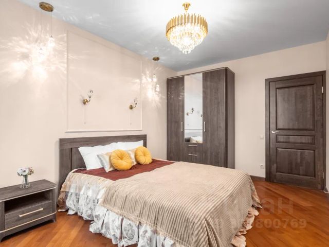 В спальне находится двуспальная кровать с ортопедическим матрасом, подушками, двуспальным одеялом, пледами. Полноценный трёхстворчатый шкаф с полками, комод