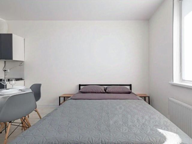 Квартира однокомнатная очень светлая, солнечная, с просторным залом-комнатой, но есть шторы, чтобы укрыться от яркого света утром.