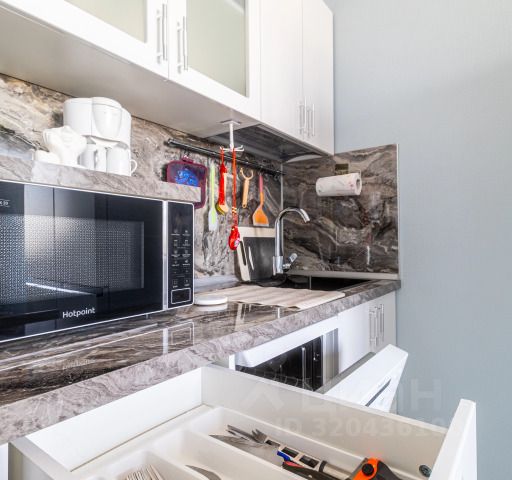 * Кухня с посудой, кухонными принадлежностями, стол барный, барные стулья.