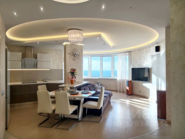 Просторная кухня-гостиная с телевизором, посудомоечной машиной, холодильником, духовкой-микроволновкой, индукционной плитой, кофеваркой Nespresso, раскладным диваном с ортопедическим матрасом, кухонным гарнитуром и стильной столовой зоной.