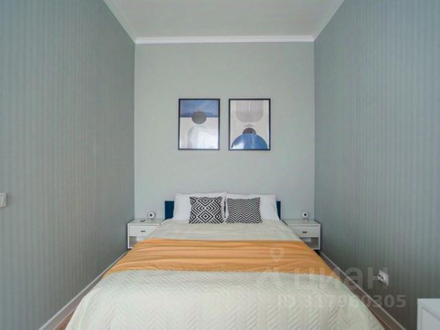 В квартире , комната 20 кв м разделена зонированием на две части .