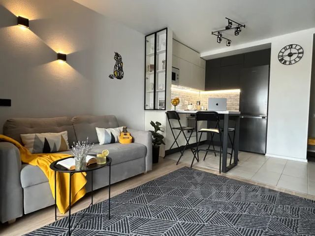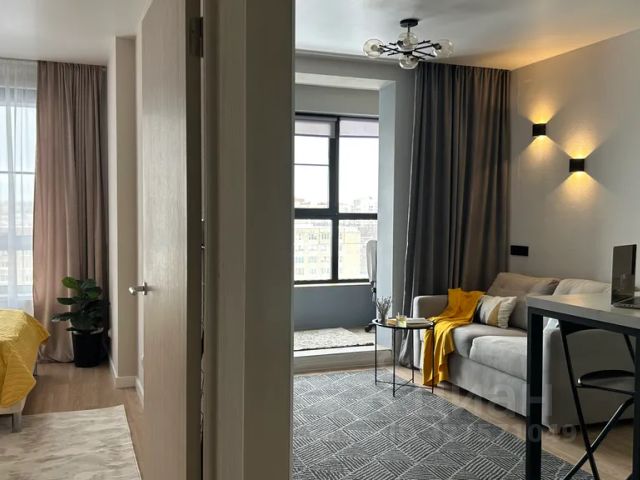 Квартира однокомнатная очень светлая, солнечная, с просторным залом-комнатой, но есть шторы, чтобы укрыться от яркого света утром.