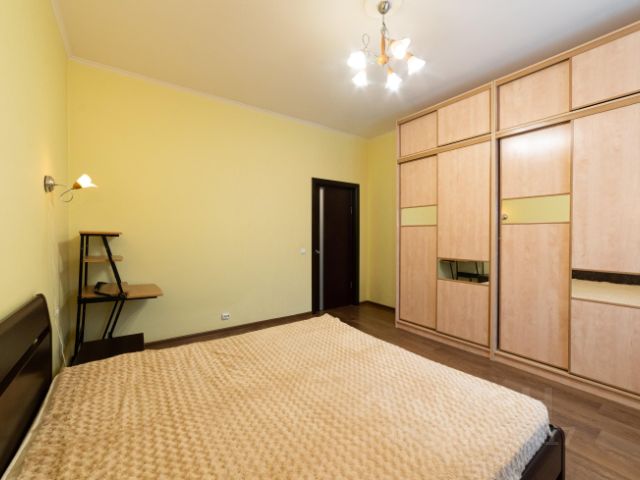 - Спальная оборудована, двуспальной кроватью, зеркальный шкаф купе, прикроватные тумбочки, ТВ.