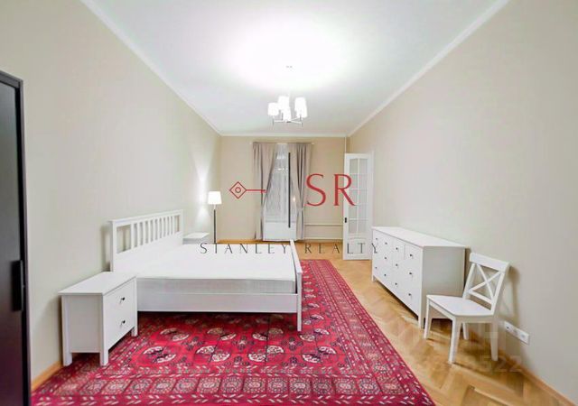 Квартира находится на 5 ом этаже, выходит окнами на Манежную площадь. Общая площадь 125 м.кв, высота потолков 3,11 м.