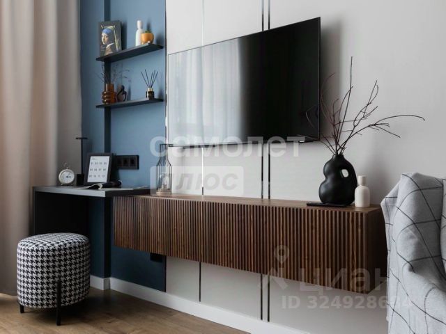 Гостиная: Большое видовое рабочее место для удаленной работы с местами для хранения, блэкаут рулонные шторы, раскладывающийся диван, журнальный столик, тумба, пуфы для отдыха, кондиционер.