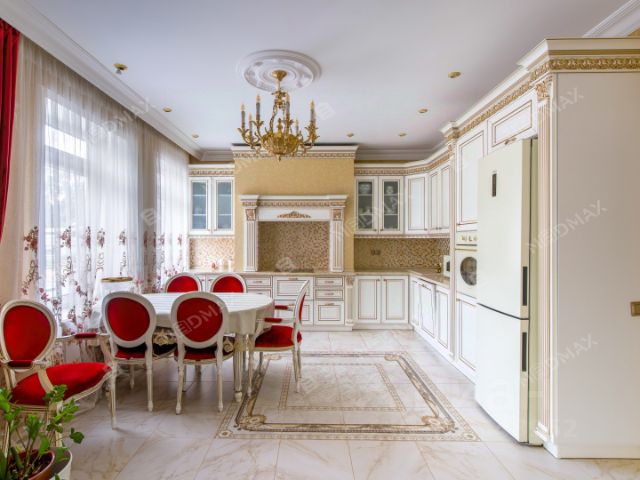 В КУХНЕ-ГОСТИННОЙ имеется: встроенная кухонная мебель с доводчиками, двуспальный диван, тв-плазма, холодильник, духовой шкаф, варочная панель, обеденная барная стойка, стулья, микроволновая печь, кофемашина, стенка, двуспальный диван, ковёр.