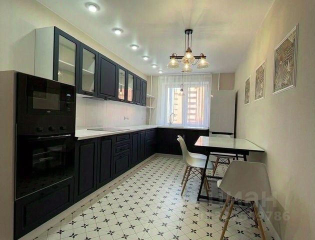 В кухонной зоне имеется кухонный гарнитур со встроенной бытовой техникой, в том числе посудомоечной машиной, а также стол со стильными стульями, телевизор и большой раскладной диван.