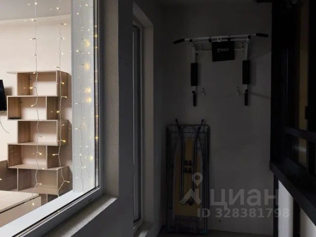 Лоджия ухоженная, есть встроенная столешница, есть барный стул, установлено освещение. На горизонте виден Залив.