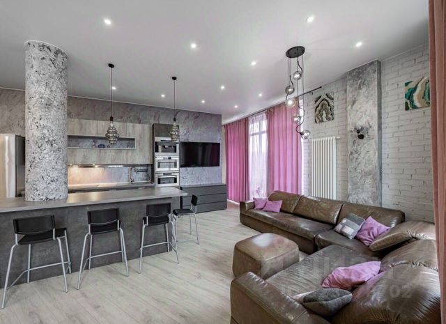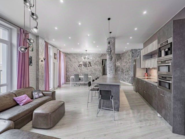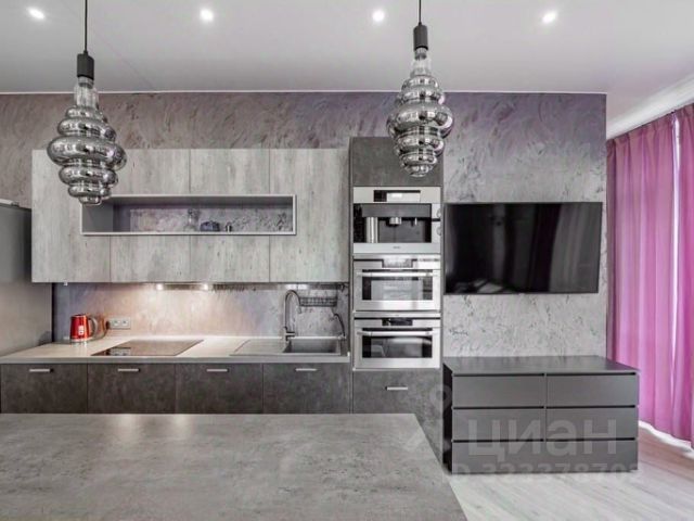 Разделена на две функциональные зоны: зона для готовки и приема пищи. Установлена столешница из искусственного камня, шкафы и рабочая зона дополнительно подсвечиваются. Предусмотрен дополнительно выезжающий стол для увеличения рабочей поверхности. Встроенная техника марки NEFF. Имеется большой холодильник.